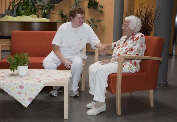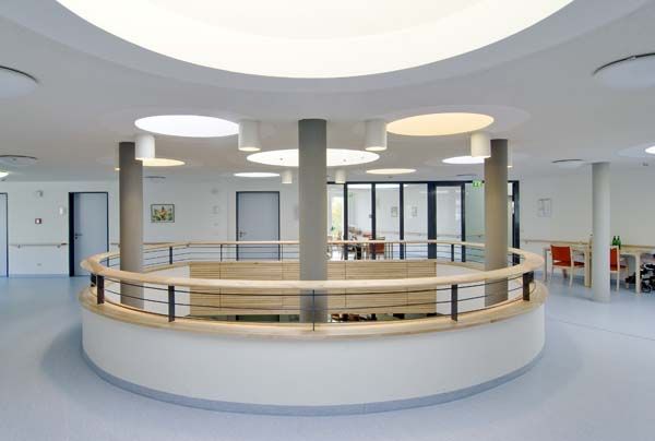 Jede Ebene verfügt über eine kleine Küche und über Gemeinschaftsecken, die tageslichtfreundlich verglast sind. Durch die wohngruppenorientierte Gliederung vermitteln die Bereiche eine überschaubare, fast familiäre und wirklich lebendige Atmosphäre. Im Eingangsbereich befindet sich ein offenes Rondell, in dem ein wunderschöner Flügel steht, der auch von unseren Bewohnern gerne benutzt wird.